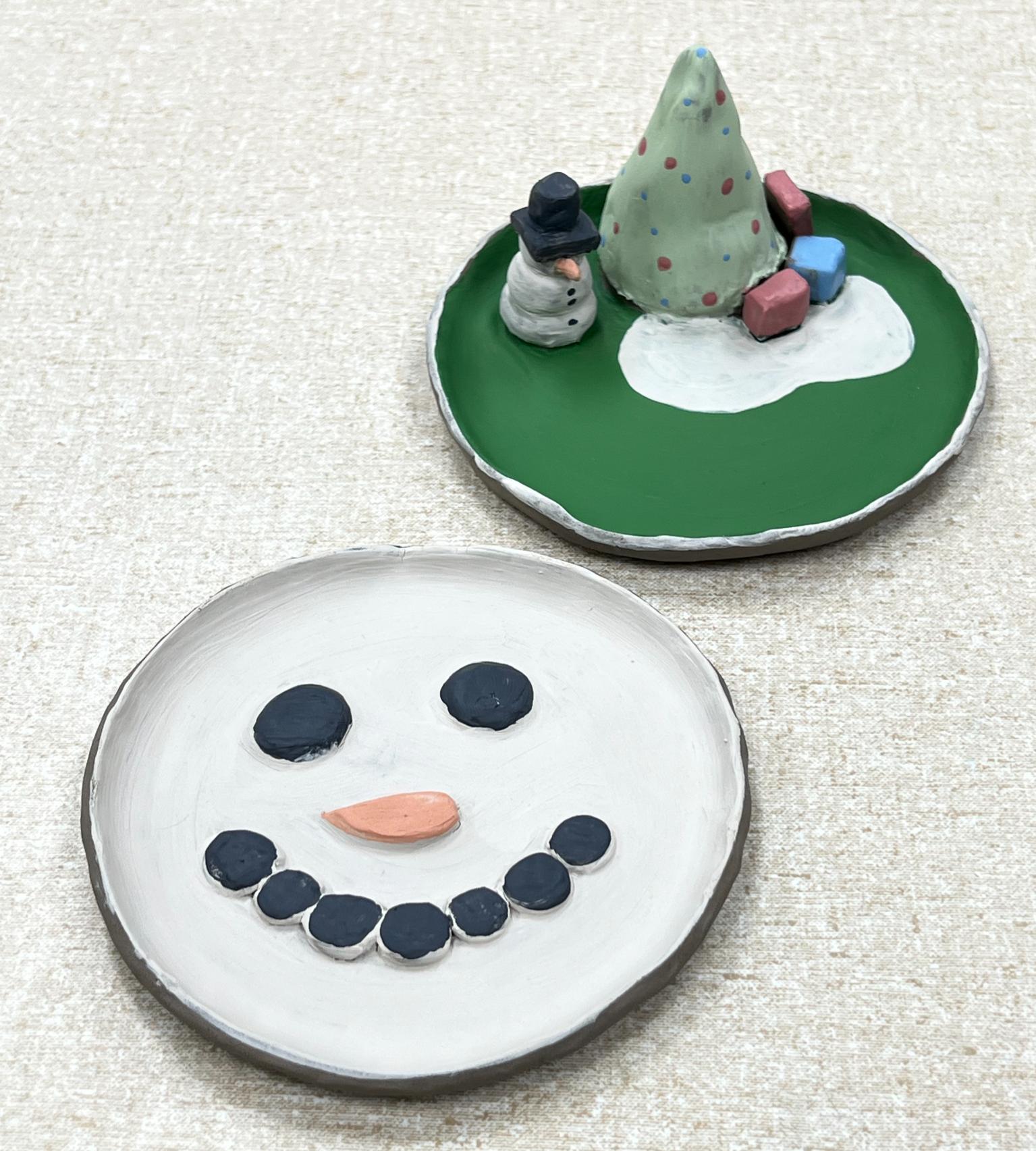 Getting creative and festive making a one of a kind holiday trinket tray. Hand build a Christmas tree , Santa or anything else that strikes your fancy. Use underglazes to add color and details.