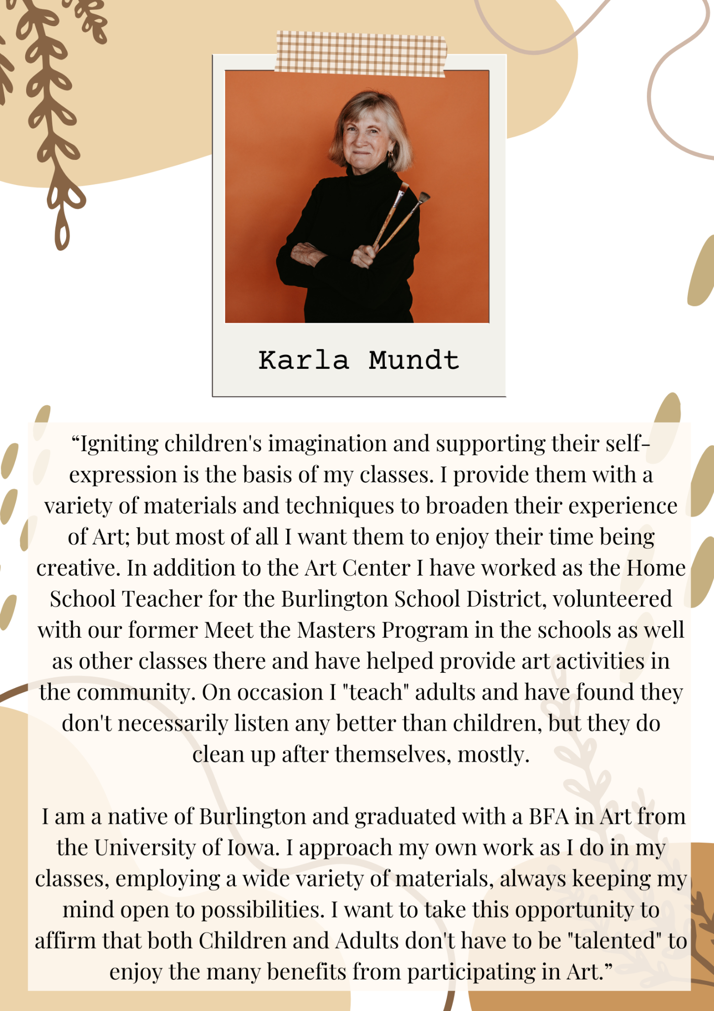 The Art Center supplies all art materials for each class unless the instructor asks for something special for a specific class.