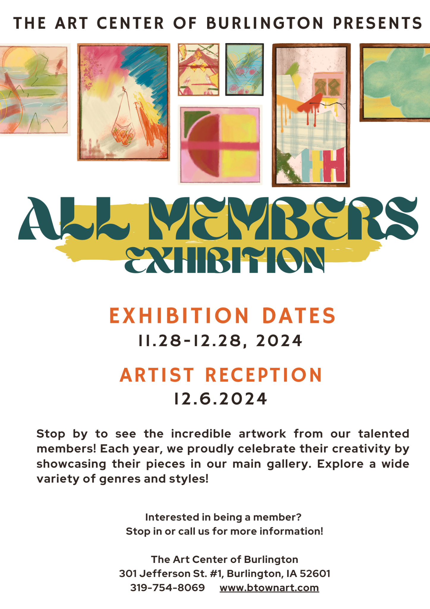 Anyone who is a current Art Center member can show up to two pieces of artwork in our annual All Member Show!