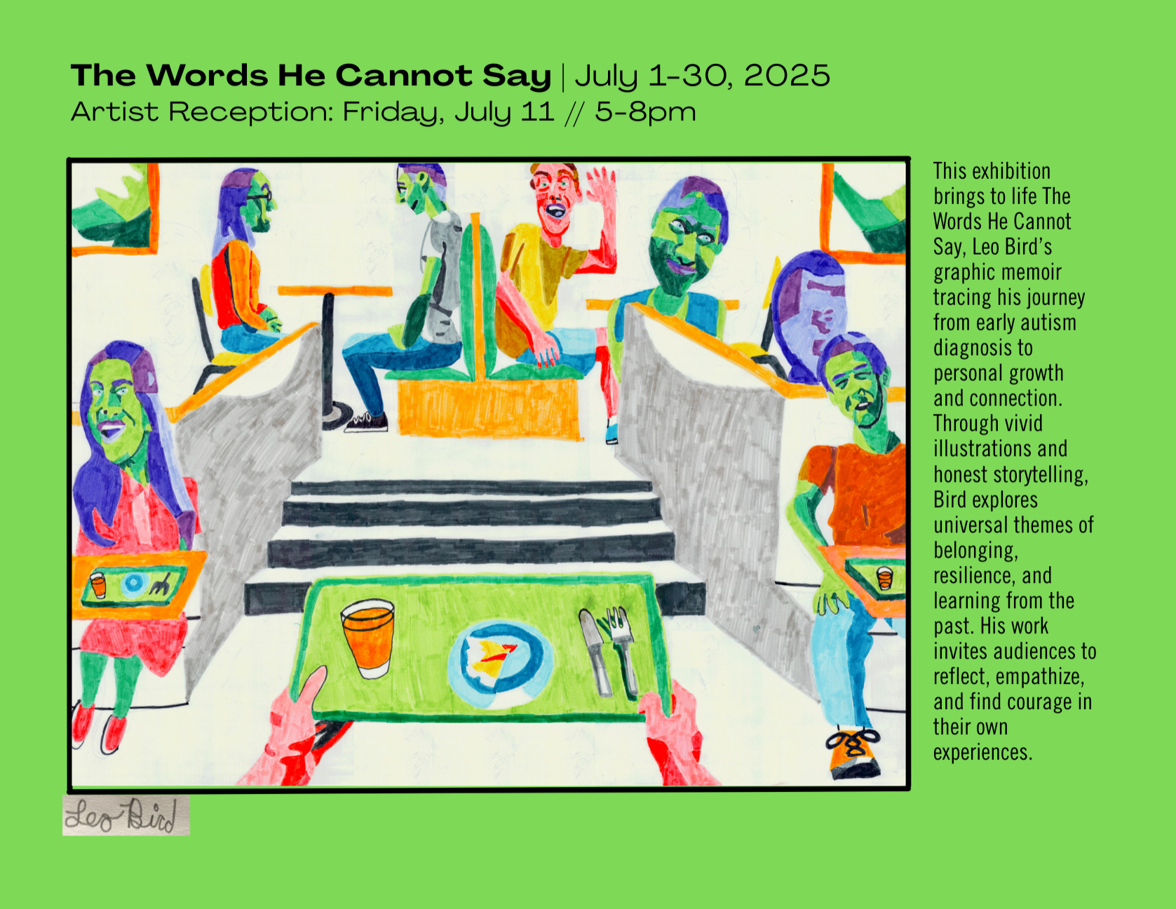 Leo Bird, an artist and writer from Ames, Iowa, created the graphic memoir The Words He Cannot Say to share his journey of navigating autism, bullying, and self-discovery with the help of supportive people in his life. Through honest storytelling and a distinct visual style influenced by contrast and simplicity, Leo explores themes of fitting in, growth, and empathy—offering insight not just into autism, but into the universal human experience. His work transforms life into art, inspiring kindness, courage, and reflection in his audience.