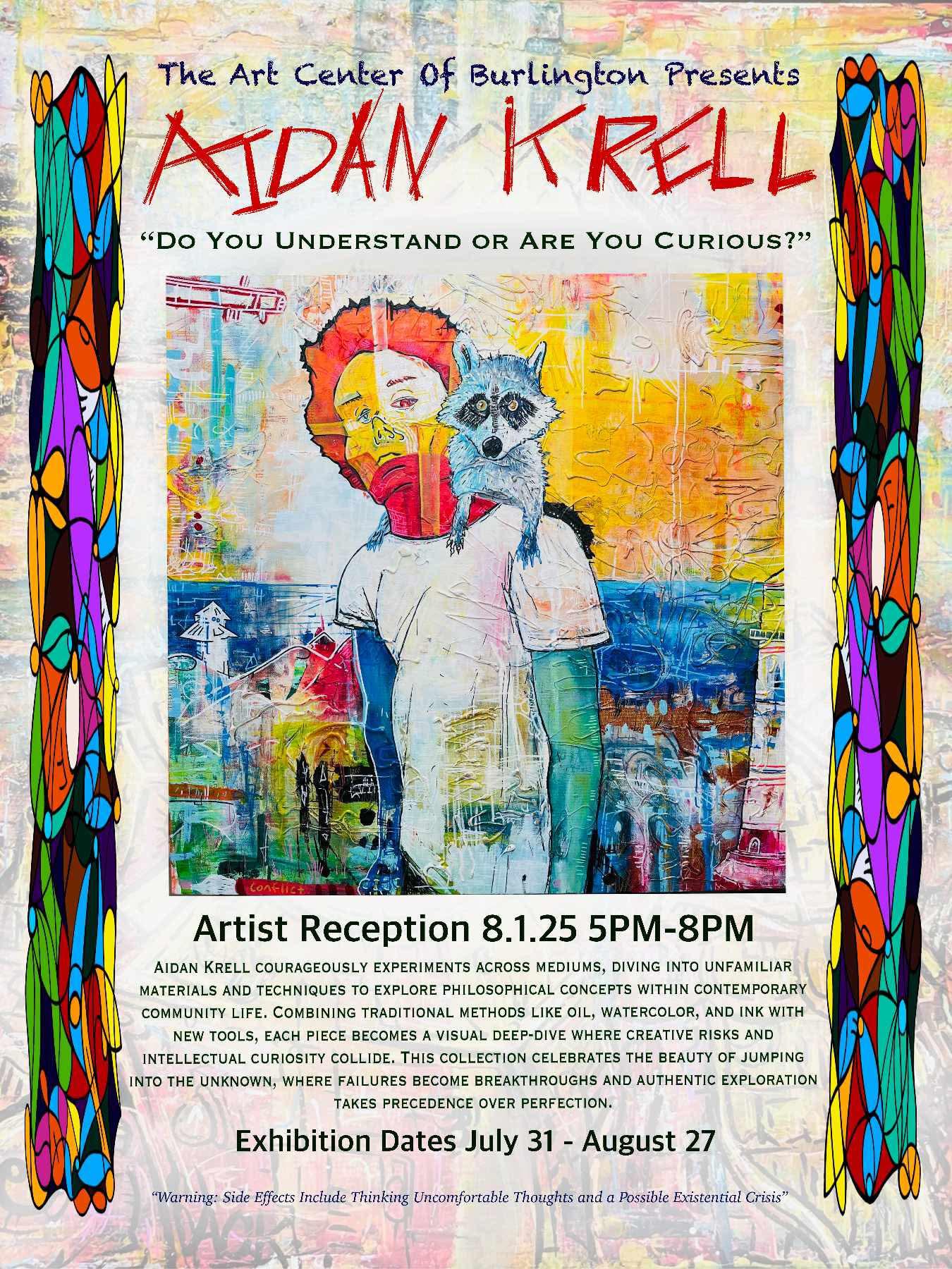 Aidan Krell is a multimedia artist born in West Burlington, Iowa. After spending a decade in North Portland during his formative years, he returned to Iowa where he has continued developing his artistic practice. Krell works fluidly across various media, choosing materials and techniques based on monthly exploration cycles that reflect his commitment to continuous experimentation. He uses art as a learning tool to explore subjects like history, science, and engineering, etc.—areas he finds more accessible through creative practice than traditional study methods.