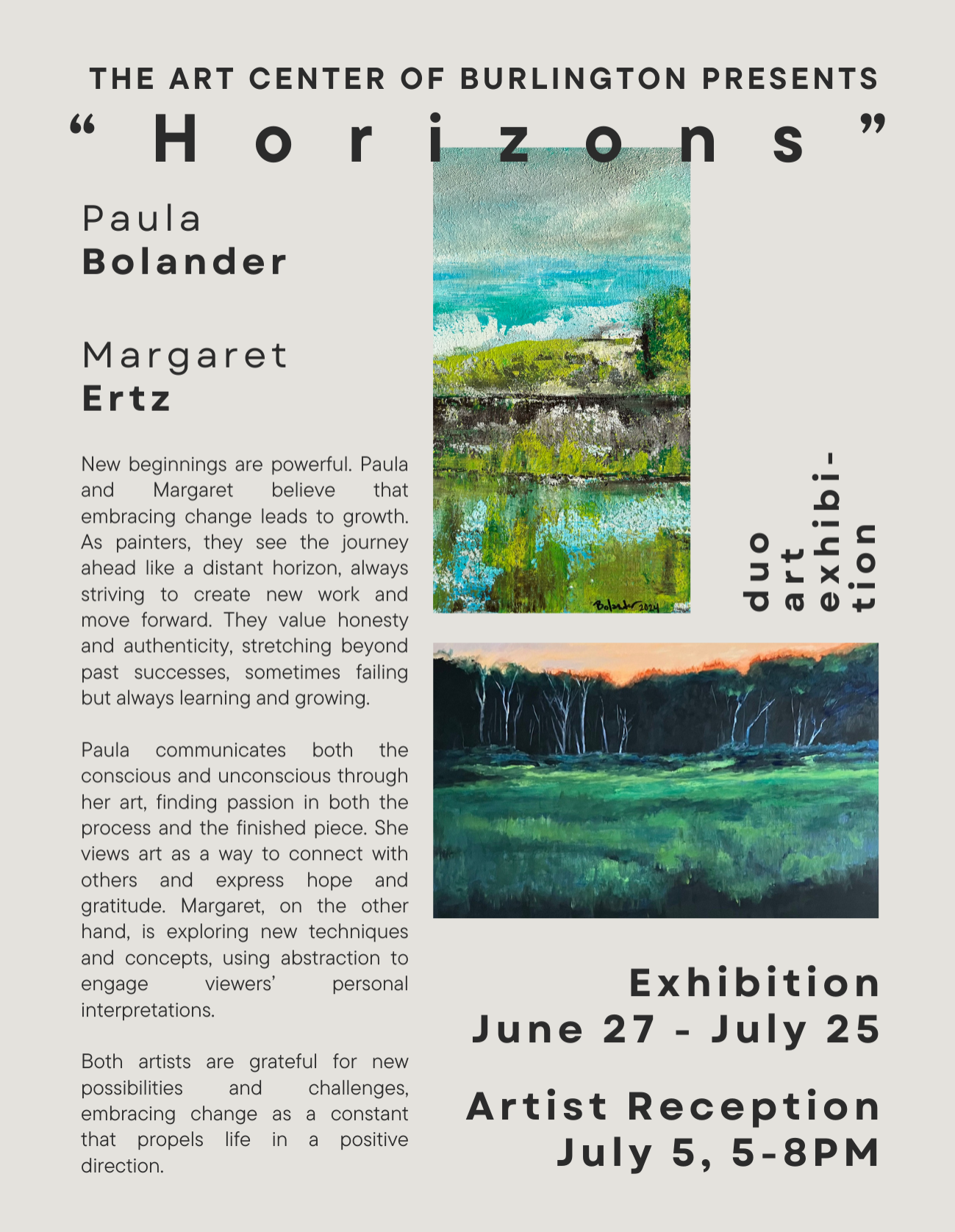 New beginnings are powerful. Paula and Margaret believe that embracing change leads to growth. As painters, they see the journey ahead like a distant horizon, always striving to create new work and move forward. They value honesty and authenticity, stretching beyond past successes, sometimes failing but always learning and growing.