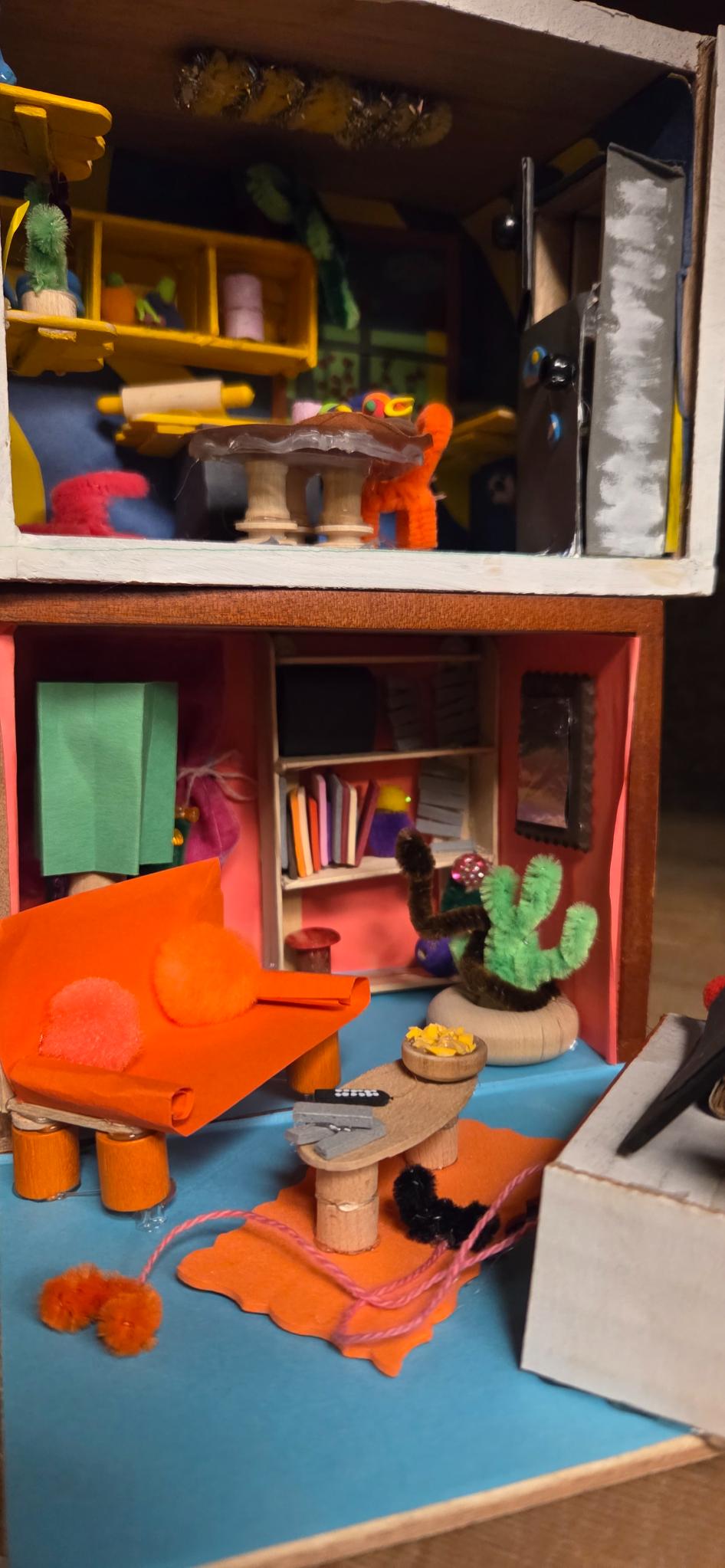 Using all sorts of multimedia, we will create a tiny playroom featuring all our favorite things to do. From our couch and gaming/movie-watching area to our bookshelves full of collectibles and games. We will involve our pets, our favorite stuffies and sports equiptment and anything else we love spending our time doing. Inside a tiny box we will use paper, beads, cloth, drawing, painting and sculpting to make our dream playrooms from floor to ceiling.