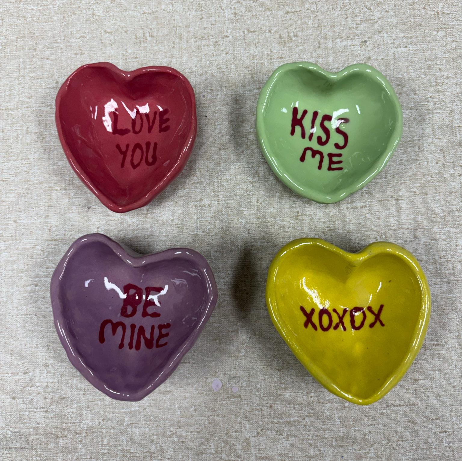 Think conversation candy hearts—but in clay. In this class, you’ll make four heart-shaped pinch pot dishes and decorate them with underglaze in classic pastel candy colors. Sweet, functional, and perfect for gifting (or keeping).