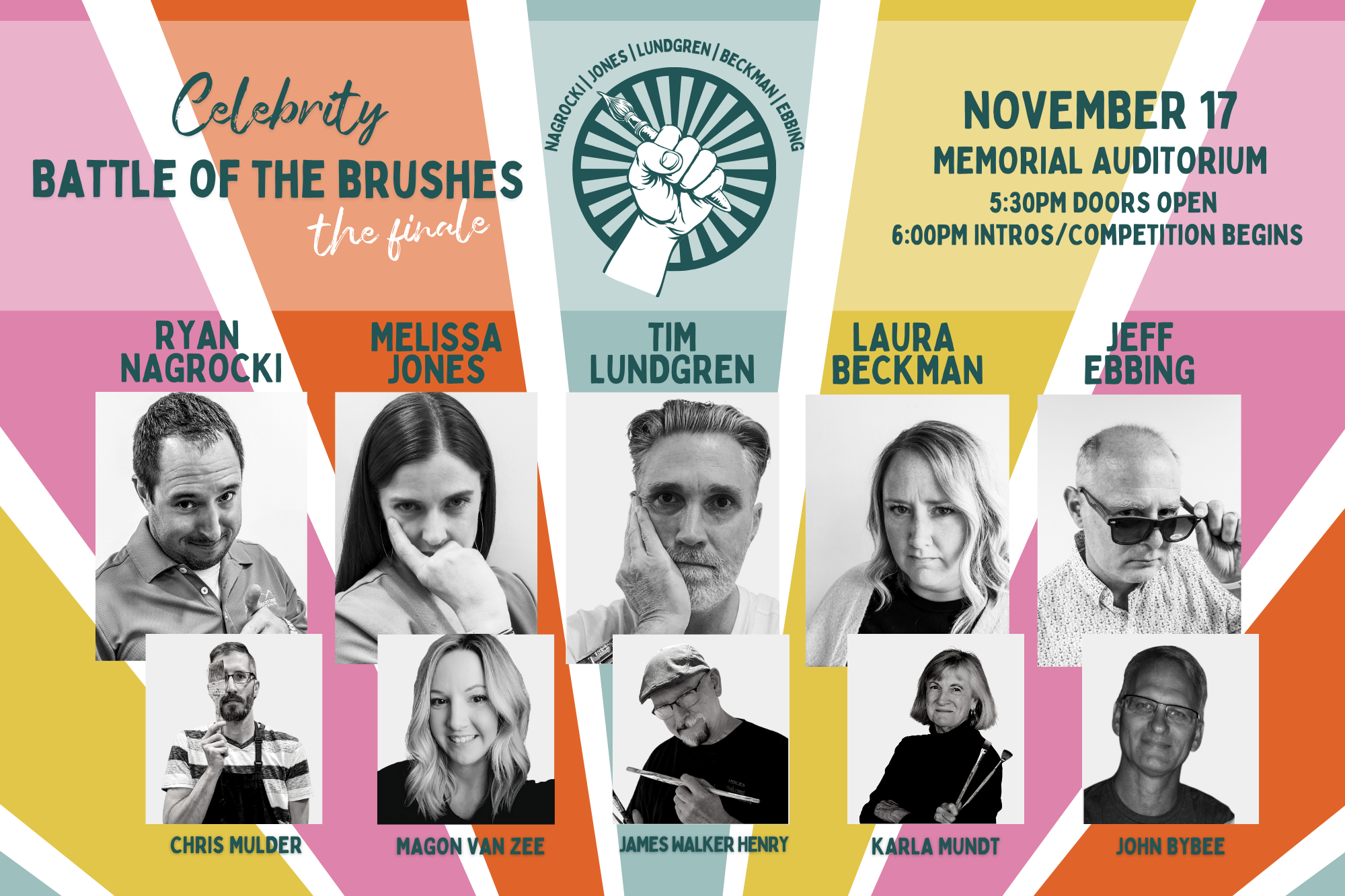The Celebrities will paint an original piece of art in front of a live audience on a 20"x24" canvas. Here's the TWIST: the subject and theme to be painted is revealed just minutes before the painting begins at 6PM! Each Celebrity has chosen a local artist to assist them in creating their masterpiece.