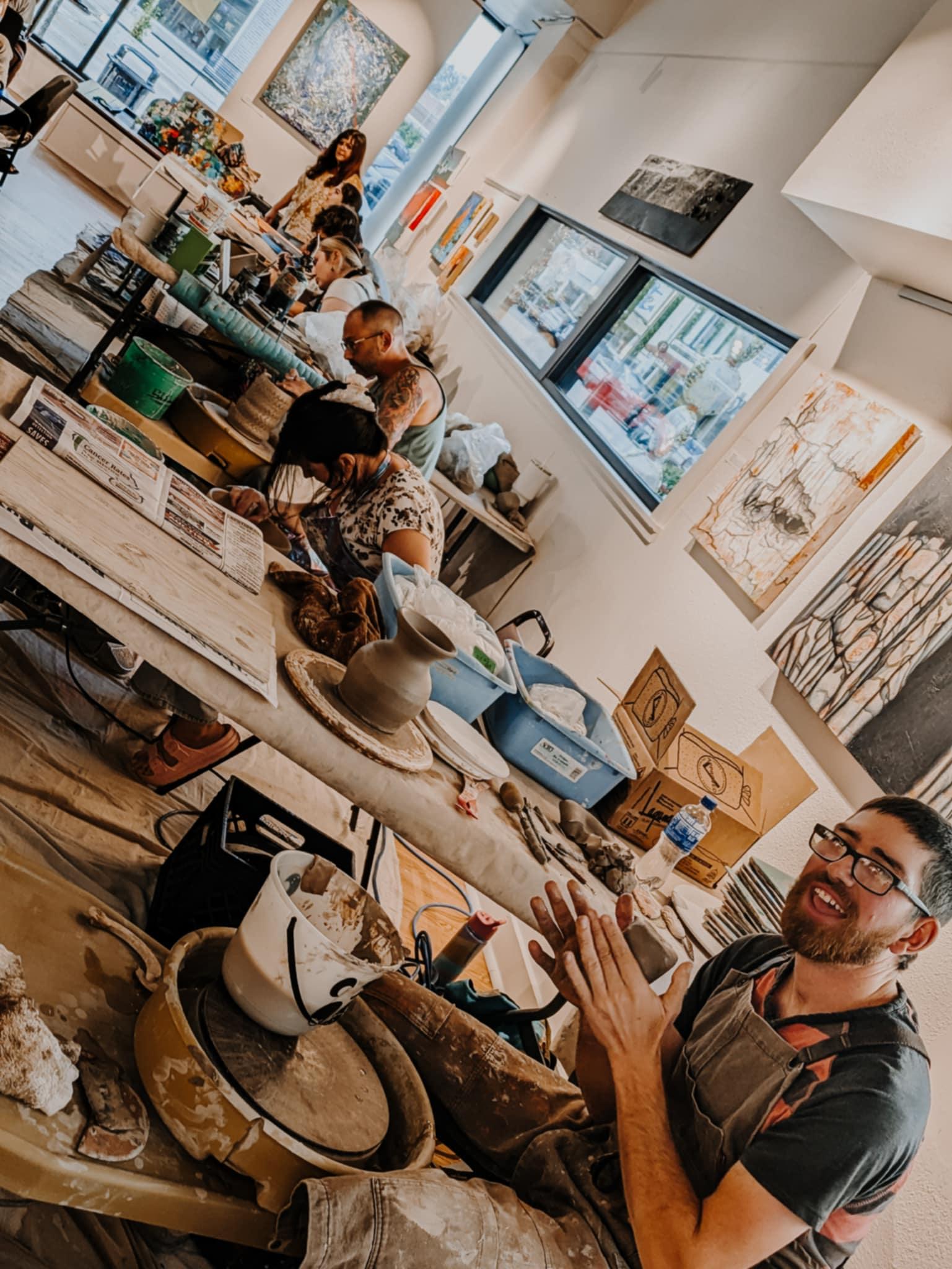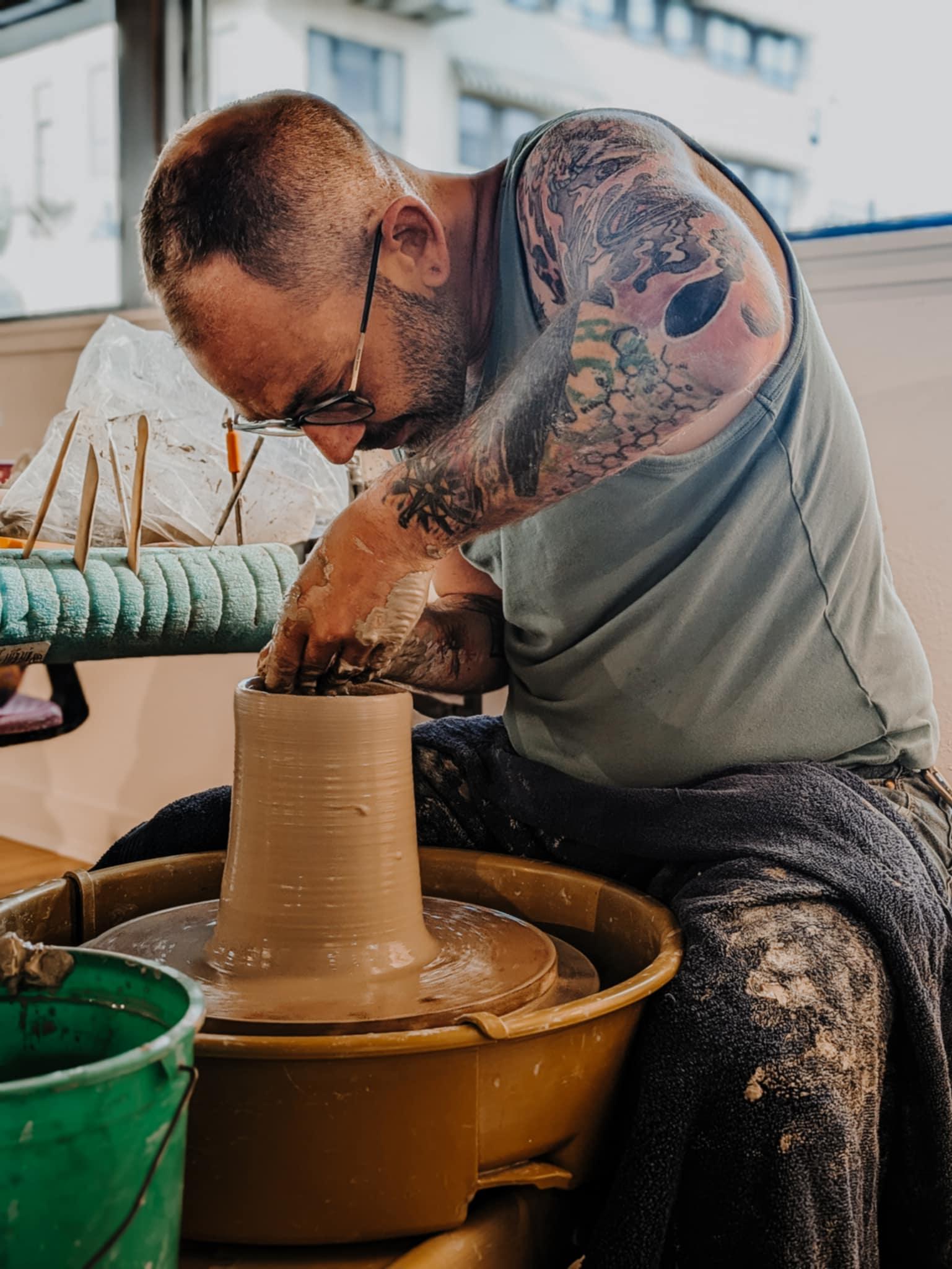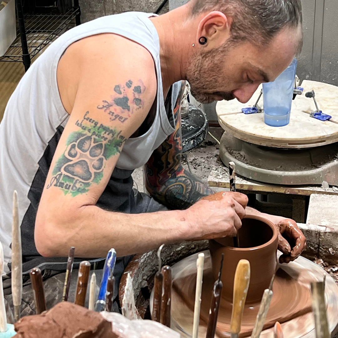 With nearly five years of clay under his belt, Ryan dove into ceramics as a way to channel creativity and support his journey through recovery. He now works out of his home studio—built with help from his partner Wes—and specializes in stunning raku planters that pair beautifully with his succulent business, Spikes and Sucs.