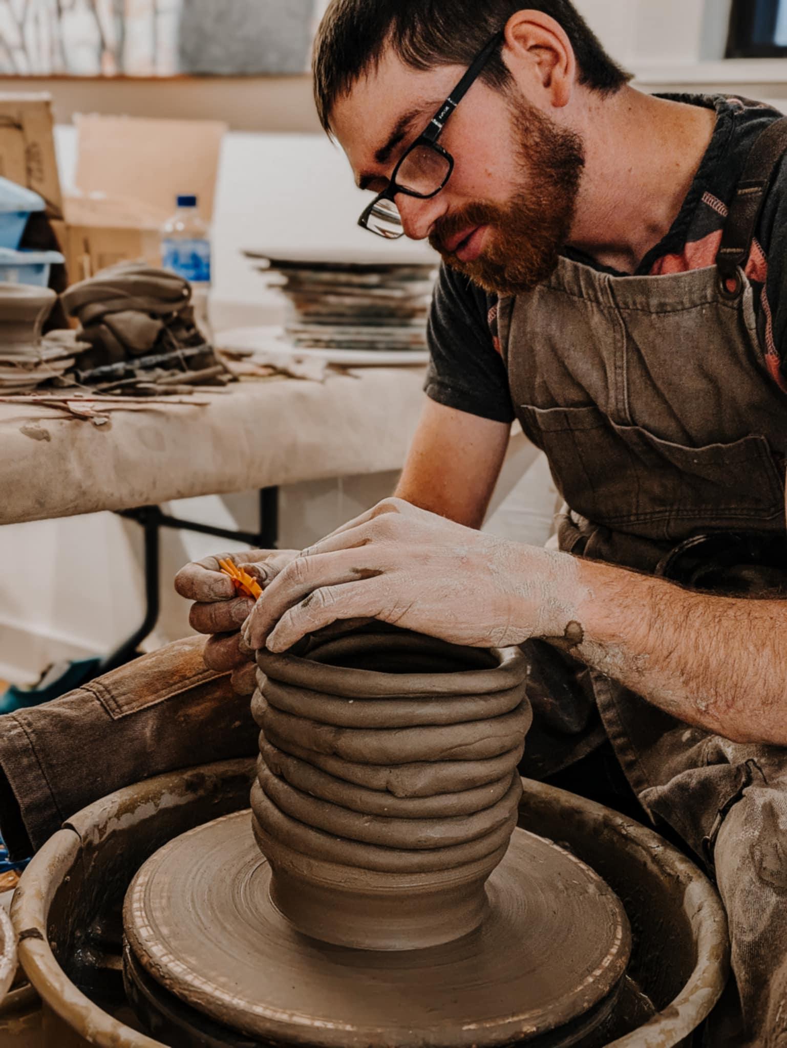 What began as a high school ceramics class turned into a lifelong passion. After working as a studio tech at SCC, Detrich kept throwing and joined the Art Center to keep learning and growing. With support from his wife Morgan—who glazes and alters many of their collaborative pieces—Detrich creates everything from bowls to uniquely shaped vessels.