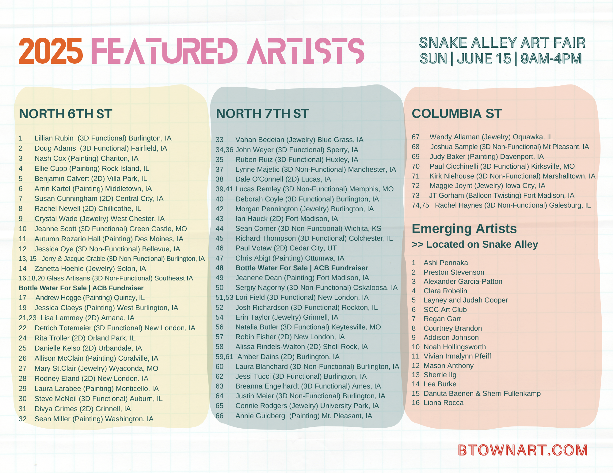 Now an annual event, SAAF encompasses much to see and buy from Midwest artists. Everything at the Snake Alley Art fair is handmade and original. Meet the artist and learn about what inspires them and how they create their art. Each piece is made with love and care. SAAF offers a one of a kind experience to see and purchase original works of fine art directly from the artists who create them!